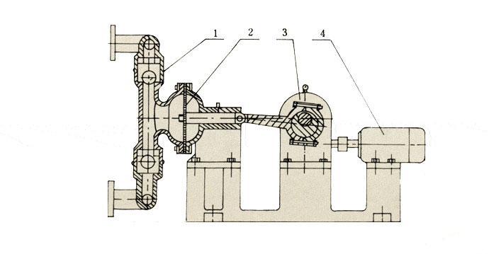 電機(4)通過減速箱(3)帶動左右兩端柱塞上面的隔膜(2)一前一后往復(fù)運動。在左右兩個泵腔內(nèi),裝有上下四個單向球閥(1)隔膜的運動,造成工作腔內(nèi)的容積的改變,迫使四個單向球閥交替地開啟和關(guān)閉,從而將液體不斷地吸入和排出。